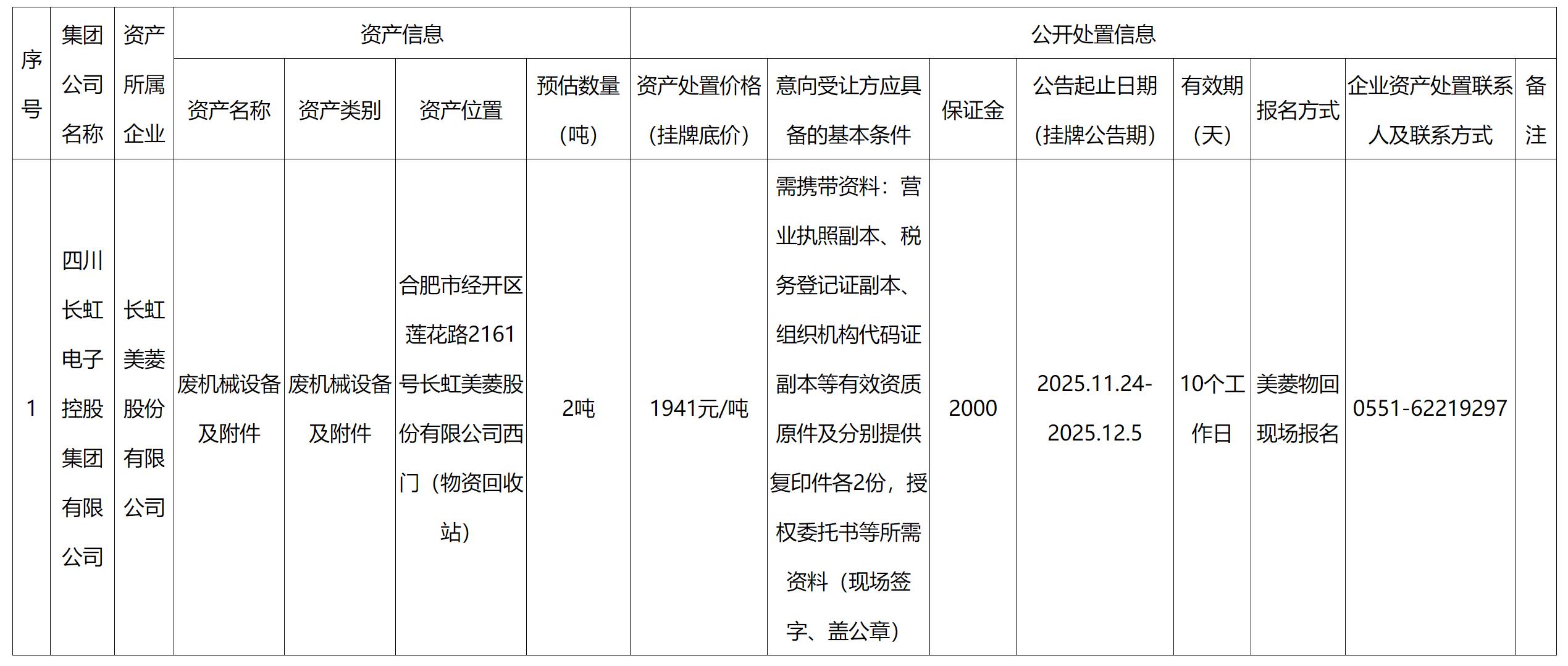 長(zhǎng)虹美菱股份有限公司資產(chǎn)處置公告
