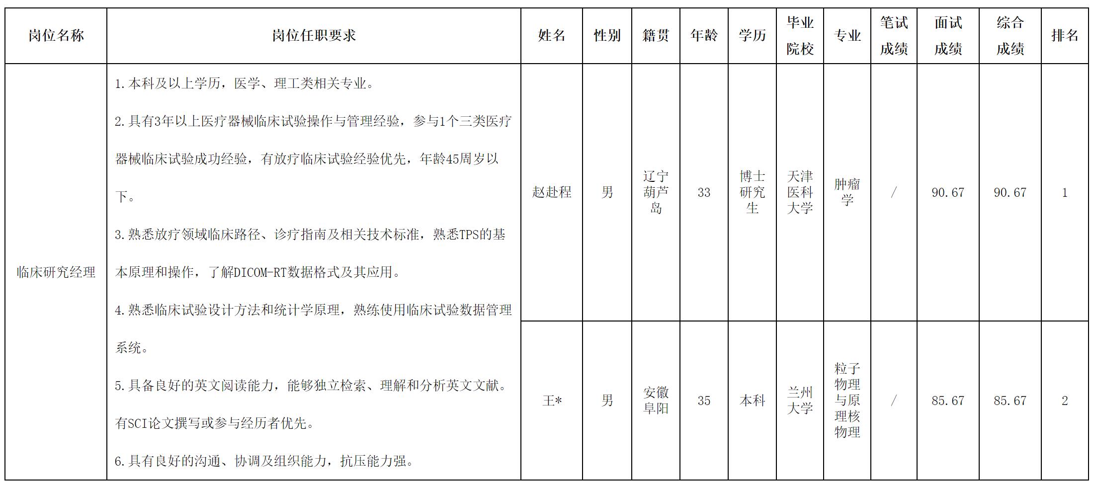根據(jù)中玖閃光醫(yī)療科技有限公司發(fā)布的招聘公告及招聘相關(guān)規(guī)定,現(xiàn)將測試成績予以公示。