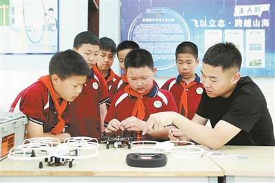 江蘇省宿遷市洋河新區(qū)實驗小學(xué)師生進(jìn)行無人機組裝與拆卸維修。 視覺中國供圖