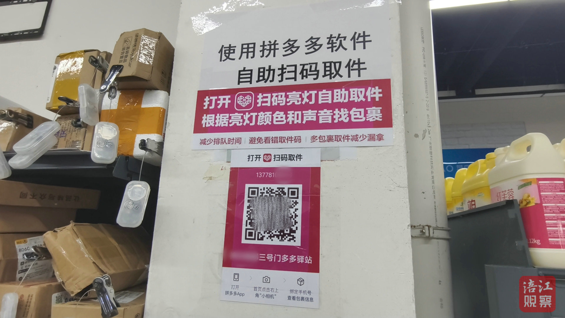 為驗證取件流程,記者下單后將包裹寄往涪城區(qū)長虹國際城,取件時,驛站工作人員直接引導(dǎo):“你取快遞用拼多多掃這個碼。”