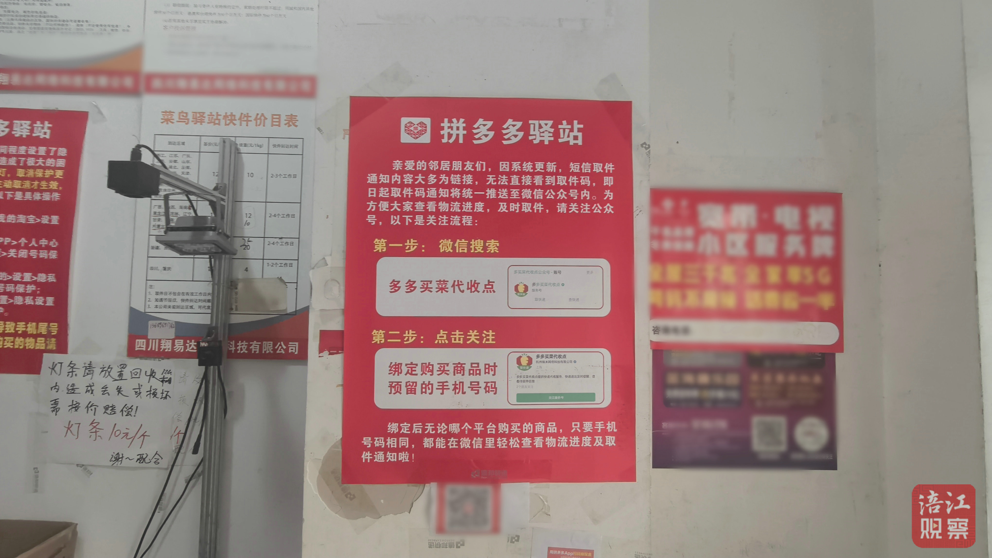 除了下載APP外,也有驛站引導(dǎo)用戶關(guān)注微信公眾號。在江油市濱江華城快遞驛站內(nèi),記者看到市民需先微信關(guān)注“多多買菜代收點”,綁定購買商品時預(yù)留的手機(jī)號碼后,也能獲得所有取件碼。