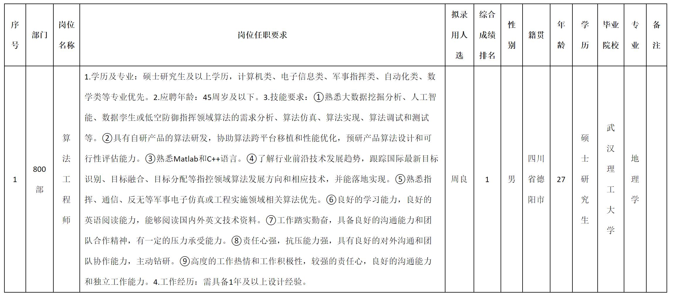 根據(jù)四川九洲電器集團(tuán)有限責(zé)任公司發(fā)布的招聘公告及招聘相關(guān)規(guī)定,經(jīng)測試、考察、體檢等程序,擬錄用周良同志到四川九洲電器集團(tuán)有限責(zé)任公司工作,現(xiàn)予以公示,具體情況如下: