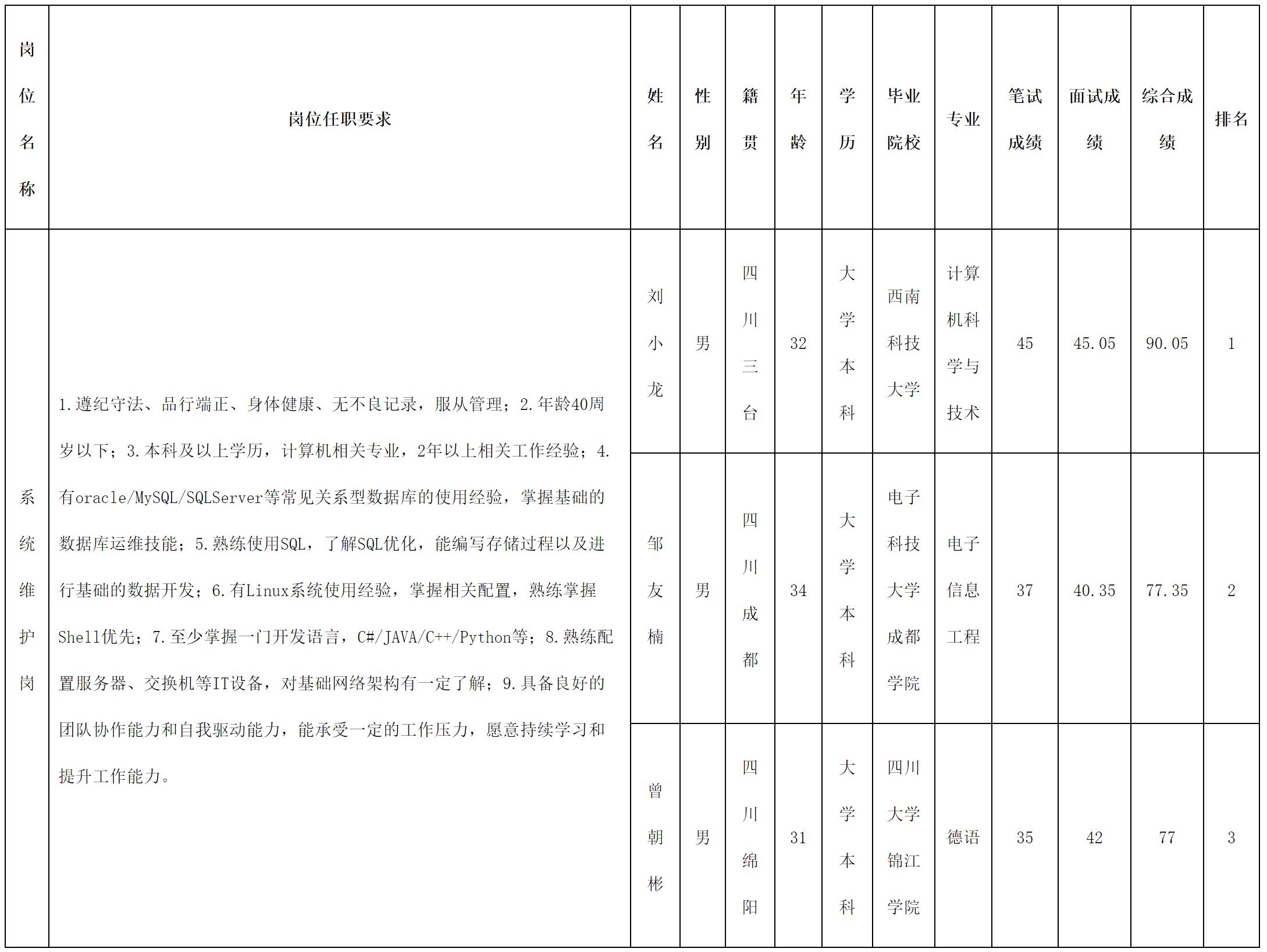 根據(jù)綿陽市綿州通科技有限責(zé)任公司發(fā)布的招聘公告及招聘相關(guān)規(guī)定,經(jīng)筆試、面試等程序,現(xiàn)將筆試、面試成績(jī)予以公示: