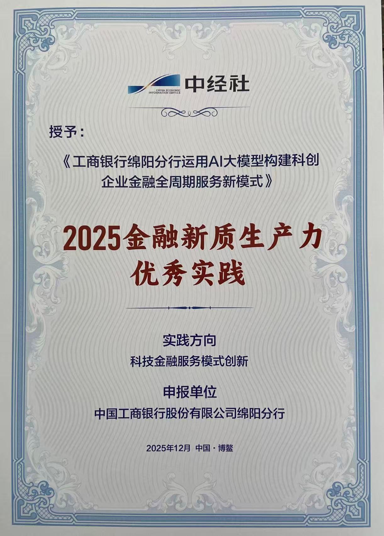 12月4日,在2025企業(yè)家博鰲論壇重要活動中,工商銀行綿陽分行《運用AI大模型構(gòu)建科創(chuàng)企業(yè)金融全周期服務(wù)新模式》實踐案例,被授予“2025金融新質(zhì)生產(chǎn)力優(yōu)秀實踐”獎項。