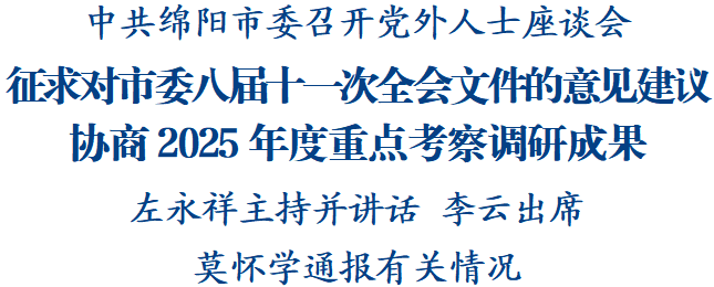 中共綿陽市委八屆十一次全會舉行前夕,市委召開黨外人士座談會,就全會文件聽取各民主黨派市(工)委會、市工商聯(lián)負(fù)責(zé)人和無黨派人士代表的意見和建議,并就2025年度重點考察調(diào)研成果進(jìn)行協(xié)商。省委常委、市委書記左永祥主持座談會并講話。