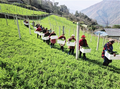 初冬的田間,一片綠意惹人注目。北川壩底鄉(xiāng)金山村村民們把裝箱好的有機(jī)豌豆尖送往集中點(diǎn)?!∮浾?唐云峰 攝