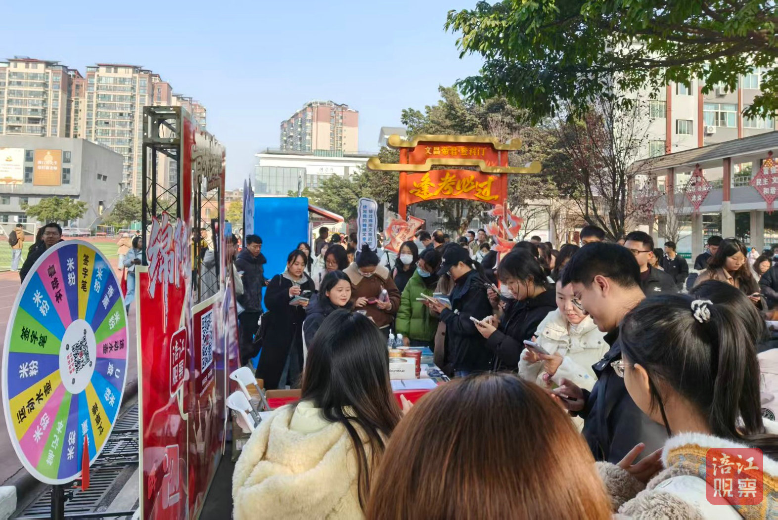 現(xiàn)場,拱門展架醒目矗立,“沾點‘涪’氣,成功上岸”等祝福手牌備受考生青睞,大家爭相與之合影。下載注冊涪江觀察客戶端的隊伍排起小長龍,考生們迫不及待排隊參與轉(zhuǎn)盤抽獎。