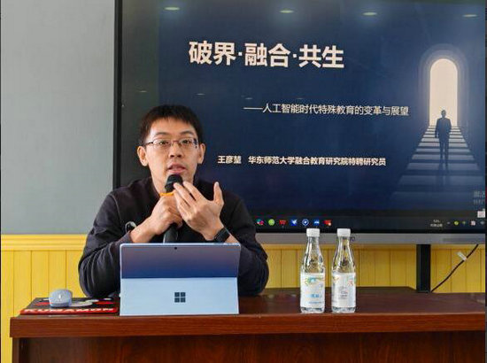 本次培訓以“破界·融合·共生——人工智能對特殊教育的變革與展望”為主題。由華東師范大學融合教育研究院特聘研究員、七維教育平臺負責人王彥堃擔任主講。培訓中,王彥堃教授憑借深厚的學術功底和豐富的實踐經驗,為老師們深入剖析了人工智能技術在特殊教育領域的廣泛應用及其帶來的深刻變革。他從智能輔助教學、個性化學習路徑規(guī)劃、情感識別與干預等多個方面,展示了人工智能技術在提升特殊教育質量和效率方面的巨大潛力。同時,王教授還展望了人工智能技術在特殊教育領域的未來發(fā)展趨勢,提出了“破界·融合·共生”的教育理念,鼓勵老師們積極擁抱新技術,實現(xiàn)教育資源的優(yōu)化配置和教育質量的全面提升。