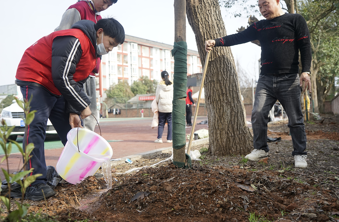 此次植樹活動別具一格,每棵新栽種的樹苗都以班級命名,成為各班集體的象征和共同成長的見證。學(xué)生們熱情高漲,干勁十足,有的挖坑,有的扶苗,有的培土,有的澆水,各個環(huán)節(jié)銜接有序,配合默契,現(xiàn)場呈現(xiàn)出一派熱火朝天的勞動景象。經(jīng)過兩個多小時的辛勤勞動,一棵棵新栽種的樹苗迎風(fēng)挺立,為初春的校園增添了勃勃生機(jī)。