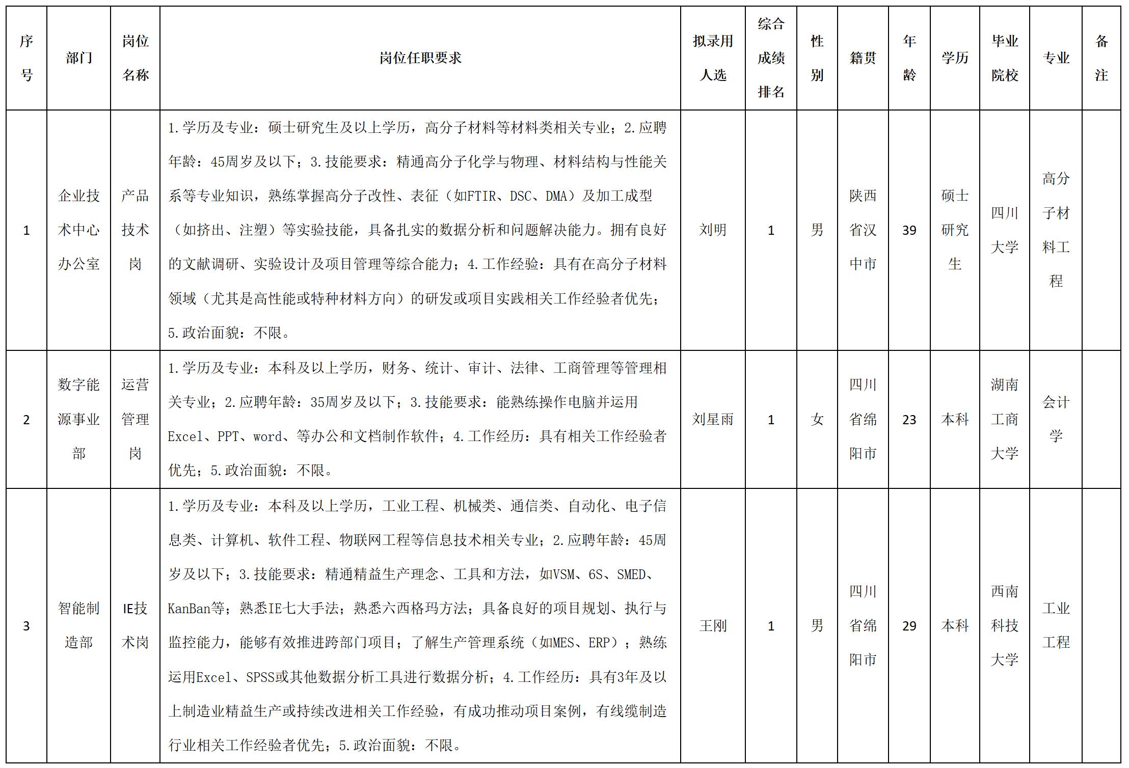 根據(jù)四川九洲線纜有限責(zé)任公司發(fā)布的招聘公告及招聘相關(guān)規(guī)定,經(jīng)筆試、面試、考察、體檢等程序,擬錄用劉明等3名同志到四川九洲線纜有限責(zé)任公司工作,現(xiàn)予以公示,具體情況如下: