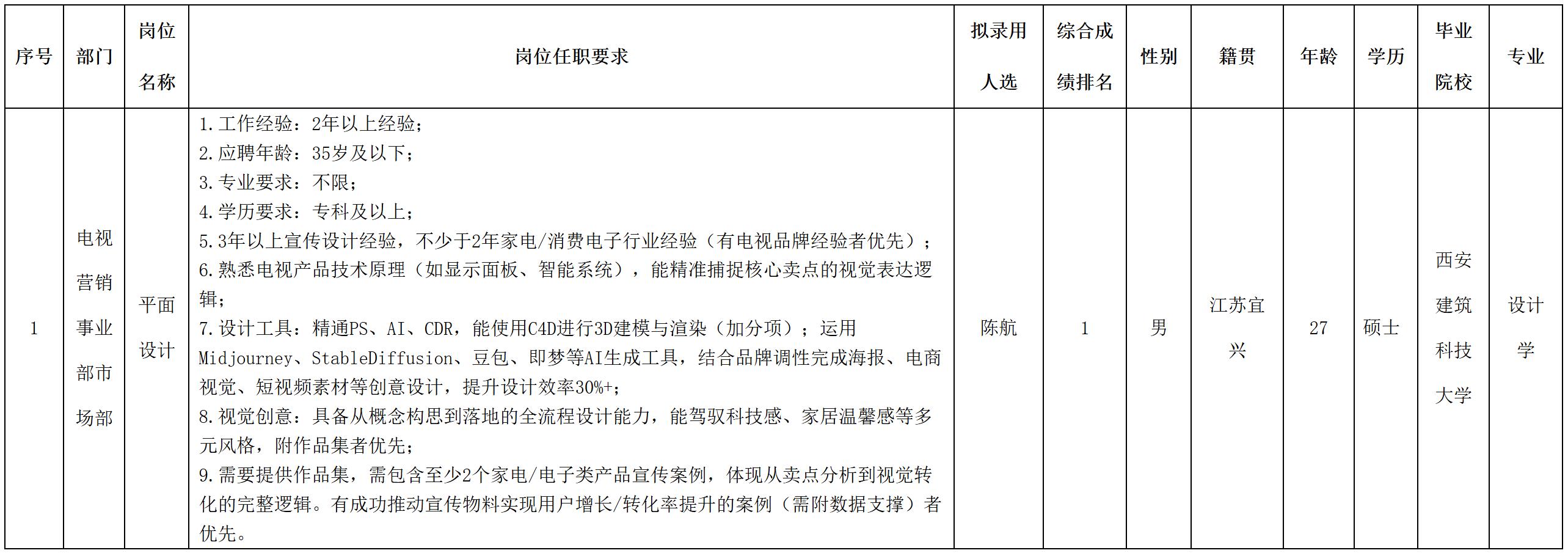 根據(jù)長虹·美菱中國區(qū)營銷總部發(fā)布的招聘公告及招聘相關(guān)規(guī)定,經(jīng)面試、考察、體檢等程序,擬錄用陳航同志到公司工作,現(xiàn)予以公示,具體情況如下: