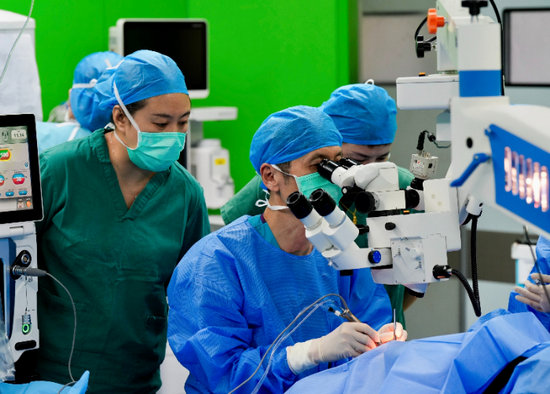 魏文斌帶領(lǐng)的眼科專家團(tuán)隊(duì)手術(shù)及帶教現(xiàn)場(施術(shù)者為史翔宇教授)