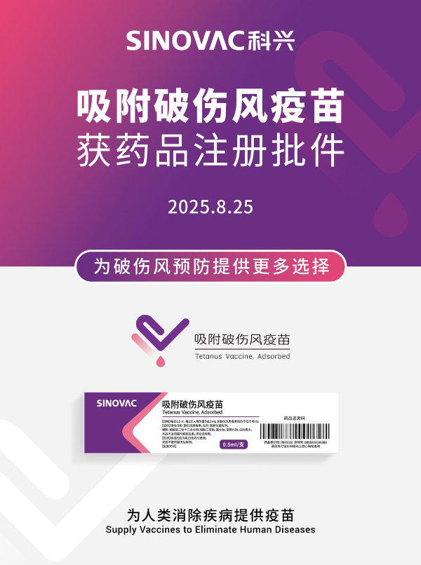 8月25日,北京科興控股(集團(tuán))有限公司旗下北京科興中維生物技術(shù)有限公司研制的吸附破傷風(fēng)疫苗獲得國家藥品監(jiān)督管理局頒發(fā)的《藥品注冊(cè)批件》(批準(zhǔn)文號(hào):國藥準(zhǔn)字S20250048),將為破傷風(fēng)預(yù)防提供更多選擇。