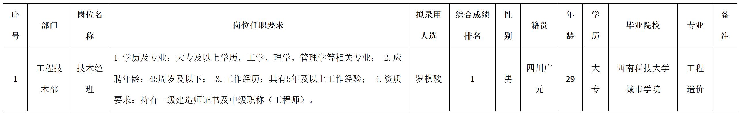 根據(jù)四川九洲建筑工程有限責任公司發(fā)布的招聘公告及招聘相關規(guī)定,經(jīng)筆試、面試、考察、體檢等程序,擬錄用羅棋駿同志到四川九洲建筑工程有限責任公司工作,現(xiàn)予以公示,具體情況如下: