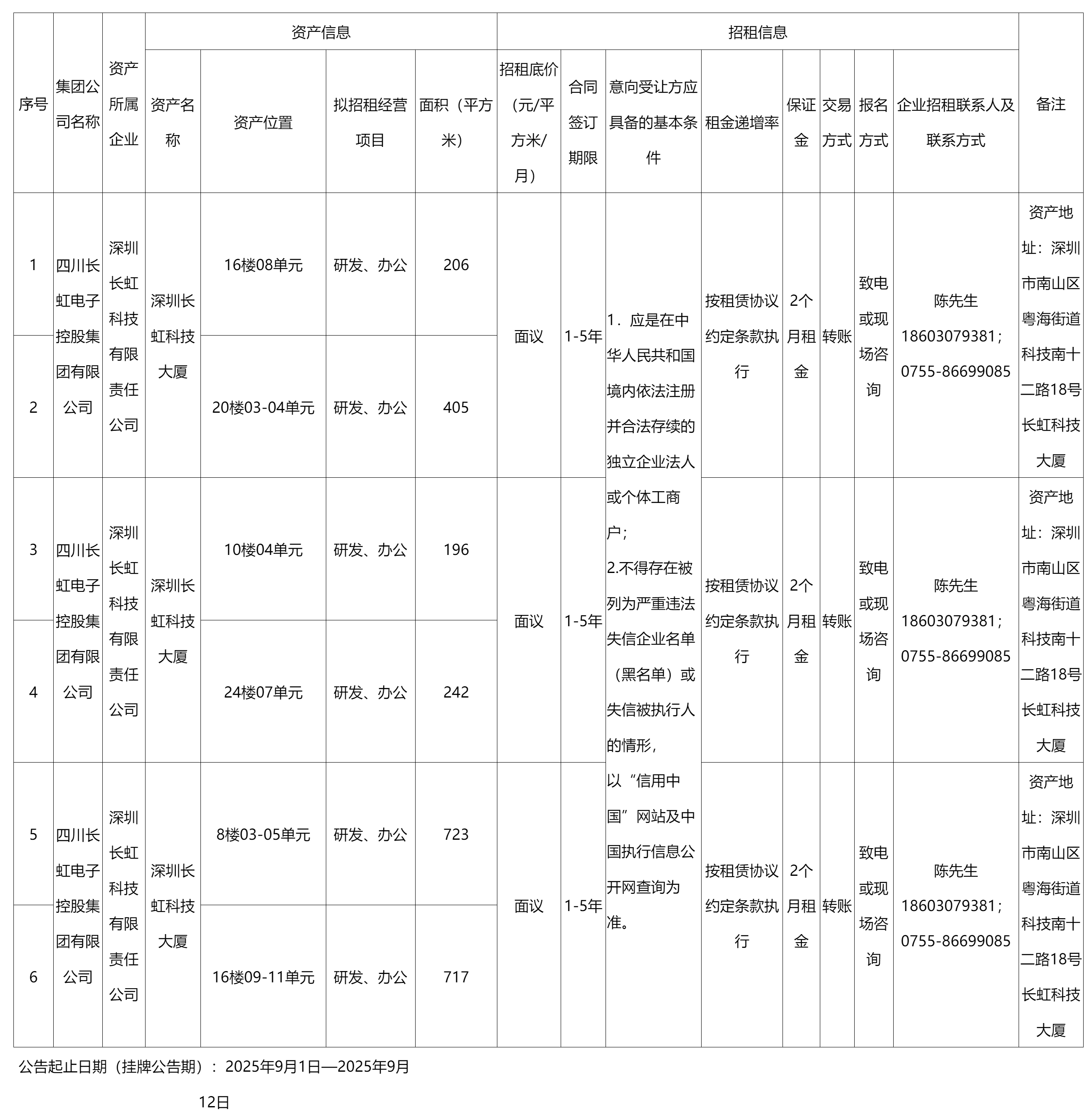 深圳長虹科技有限責(zé)任公司資產(chǎn)出租公告
