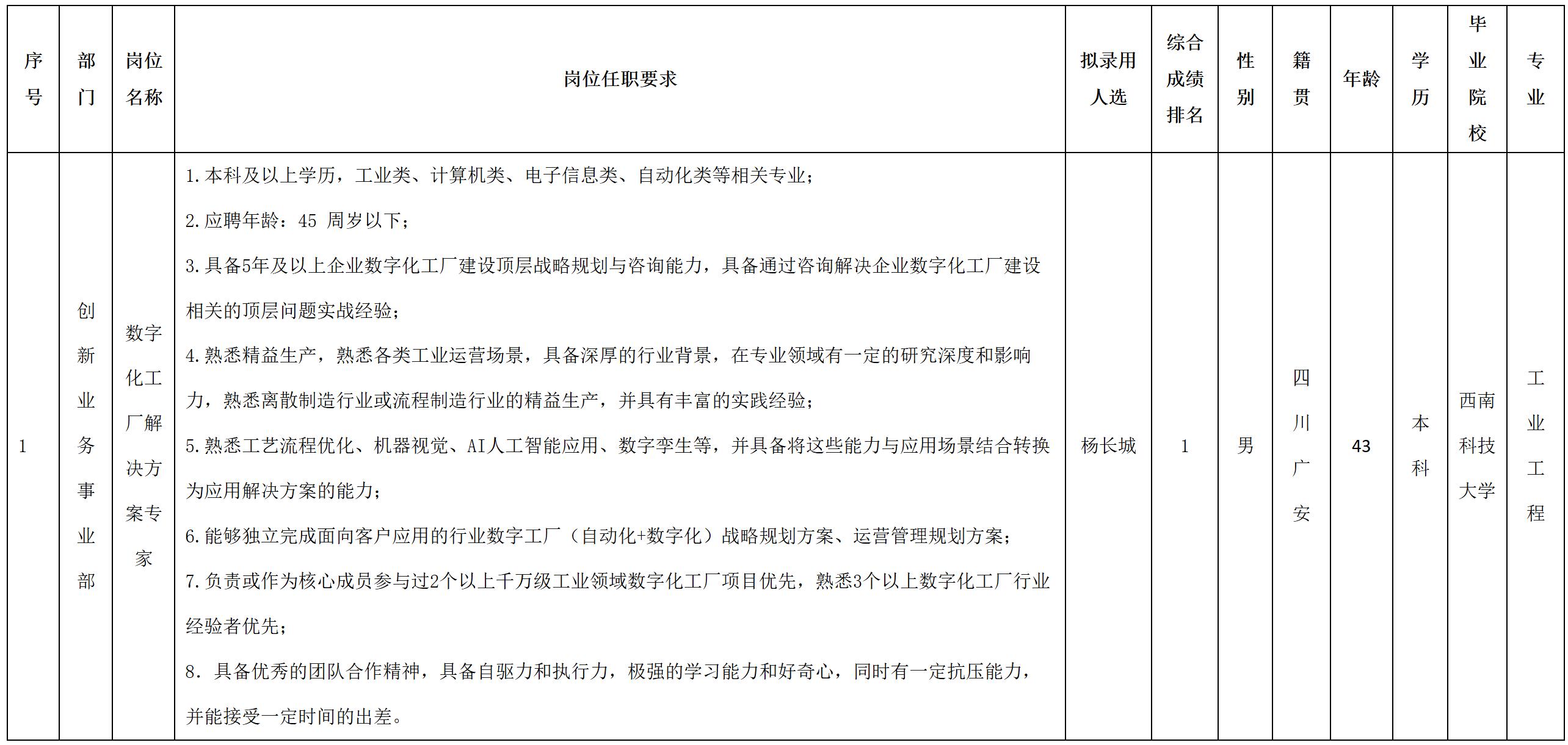 根據(jù)四川虹信軟件股份有限公司發(fā)布的招聘公告及招聘相關(guān)規(guī)定,經(jīng)面試、考察、體檢等程序,擬錄用楊長城同志到四川虹信軟件股份有限公司工作,現(xiàn)予以公示,具體情況如下: