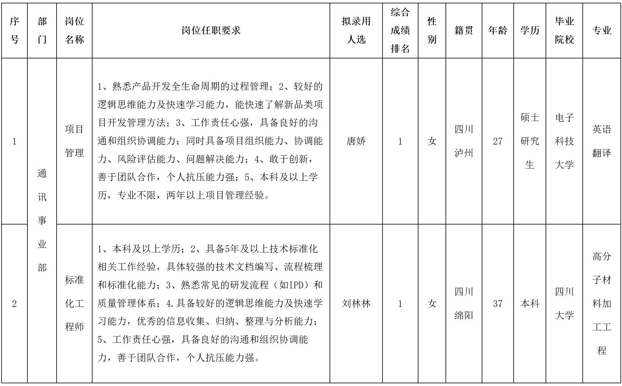 根據(jù)四川華豐科技股份有限公司發(fā)布的招聘公告及招聘相關(guān)規(guī)定,經(jīng)面試等程序,擬錄用唐嬌等同志到四川華豐科技股份有限公司工作,現(xiàn)予以公示,具體情況如下: