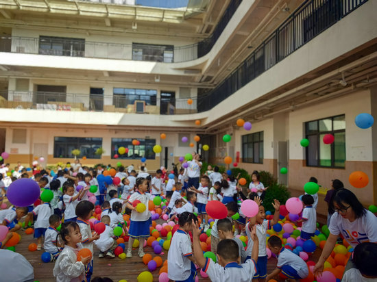 接下來的律動游戲《顏色歌》和“表情變變變”別具特色,孩子們在歡快的節(jié)奏中認識色彩、釋放天性、模仿表情,現(xiàn)場歡聲笑語不斷。“多巴胺氣球雨”環(huán)節(jié)將活動推向高潮,數(shù)百個彩色氣球從空中傾瀉而下,孩子們興奮地接球、玩球,在五彩繽紛的氣球雨中盡情歡笑,現(xiàn)場化作一片歡樂的海洋。