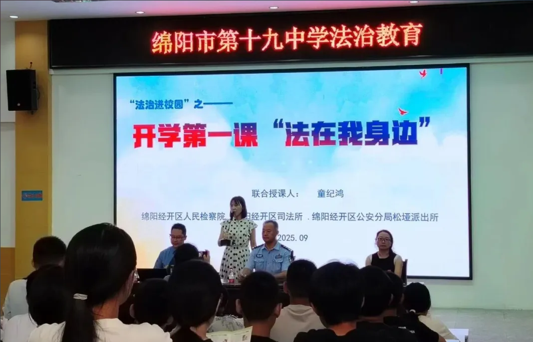 為了進一步增強學(xué)生的法治意識,營造安全、和諧、文明的校園環(huán)境,9月4日,綿陽市第十九中學(xué)聯(lián)合綿陽經(jīng)開區(qū)人民檢察院、司法所及公安分局松埡派出所,開展了以“開學(xué)第一課:法在我身邊”為主題的2025年秋法治教育系列活動。