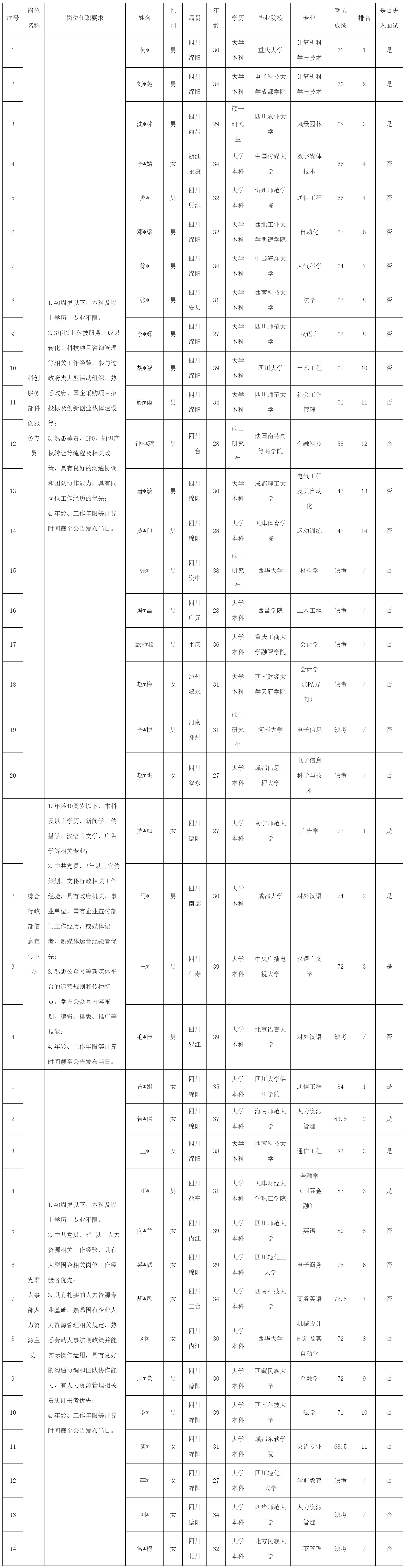 根據(jù)綿陽科技城科技創(chuàng)新投資有限公司發(fā)布的面向社會招聘公司第二批中層管理人員及員工公告及招聘相關(guān)規(guī)定,現(xiàn)將筆試成績予以公示。