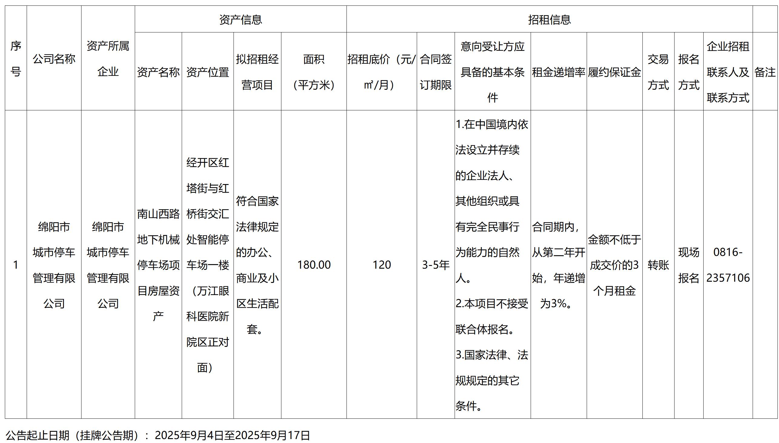 綿陽市城市停車管理有限公司資產(chǎn)出租公告