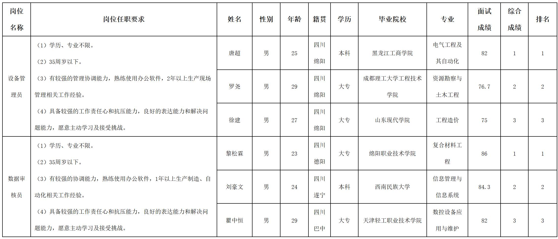 根據(jù)四川長虹虹微科技有限公司發(fā)布的招聘公告及招聘相關(guān)規(guī)定,經(jīng)面試等程序,現(xiàn)將成績予以公示。