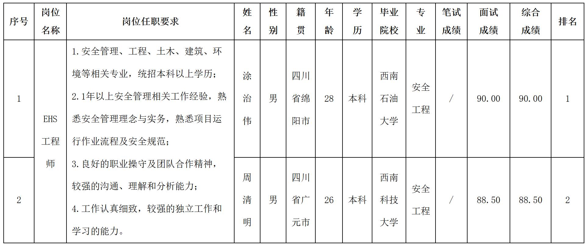 根據(jù)四川波鴻實(shí)業(yè)有限公司發(fā)布的招聘公告及招聘相關(guān)規(guī)定,經(jīng)面試等程序,現(xiàn)將面試成績(jī)予以公示。