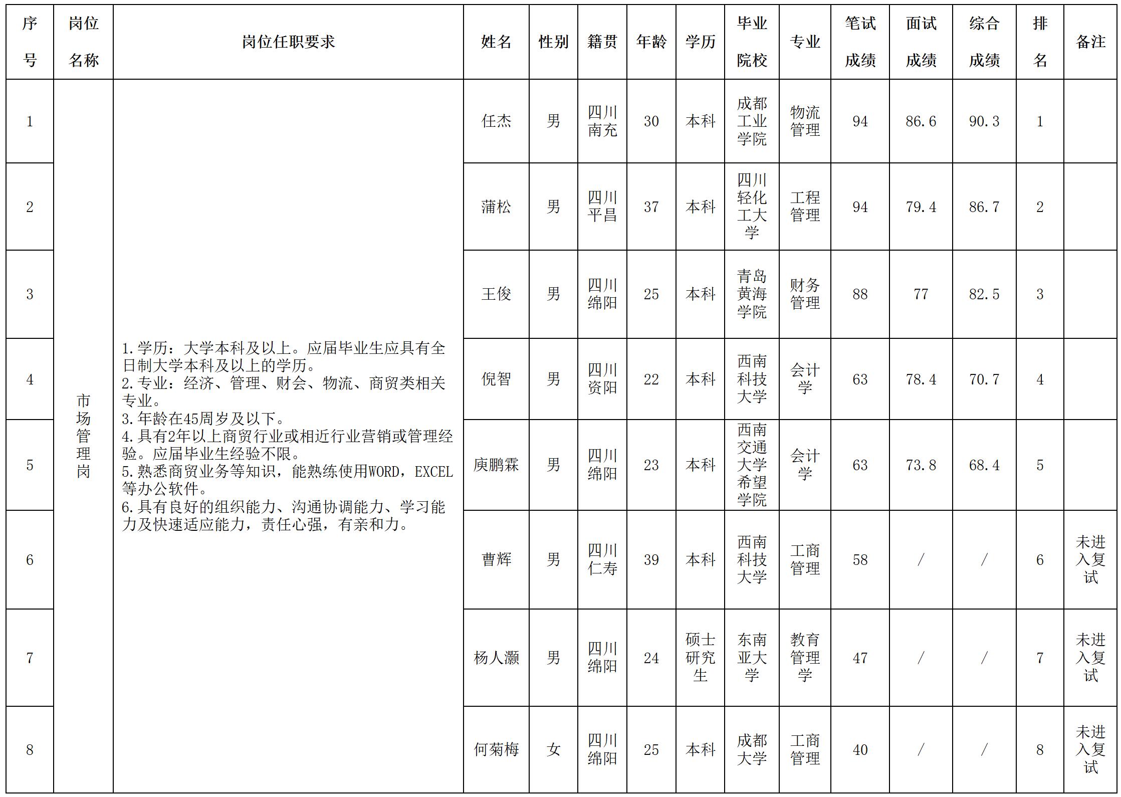 根據(jù)大道供應(yīng)鏈公司發(fā)布的招聘公告及招聘相關(guān)規(guī)定,經(jīng)筆試、面試等程序,現(xiàn)將成績予以公示。