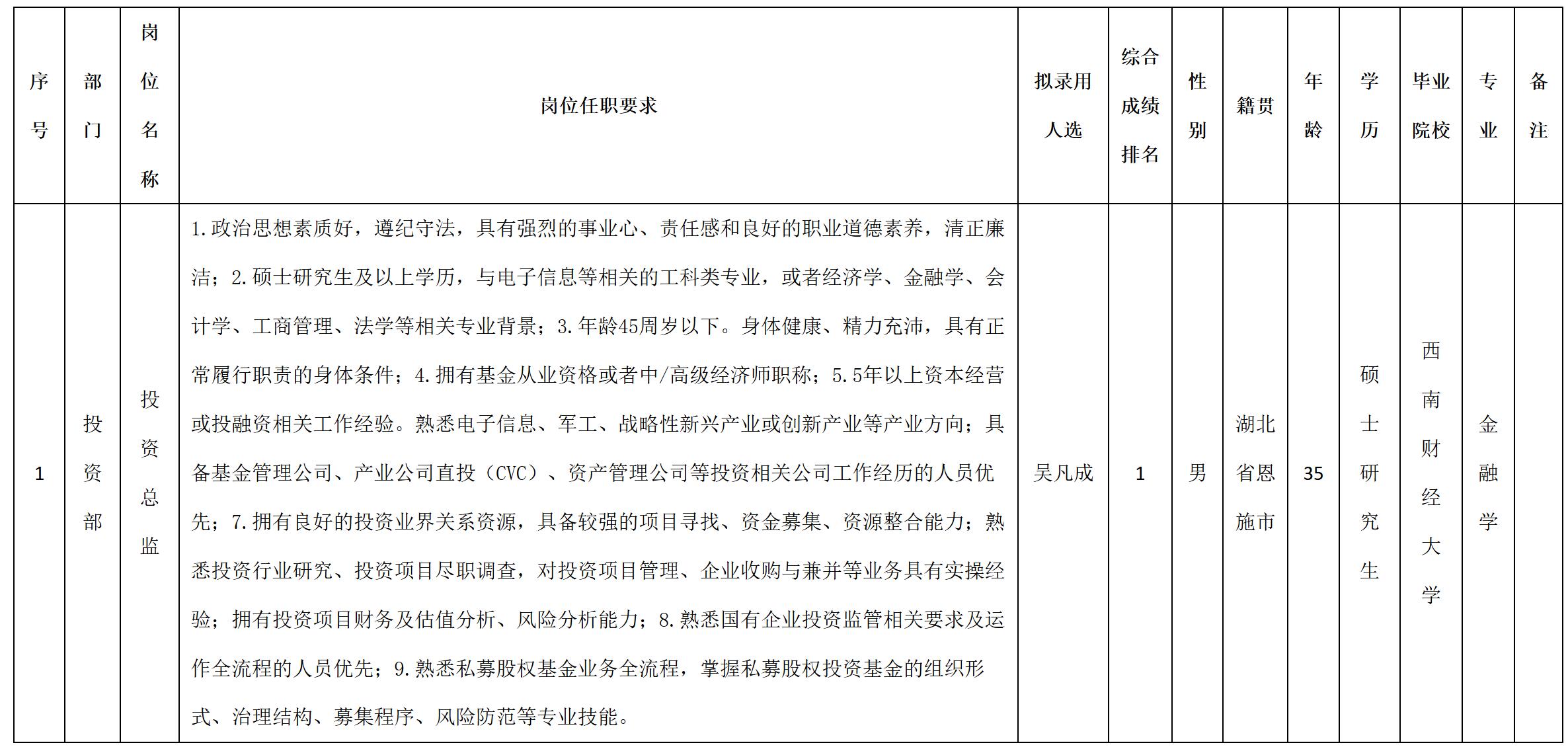 根據(jù)四川九洲君合私募基金管理有限公司發(fā)布的招聘公告及招聘相關規(guī)定,經筆試、面試、考察、體檢等程序,擬錄用吳凡成同志到四川九洲君合私募基金管理有限公司工作,現(xiàn)予以公示,具體情況如下: