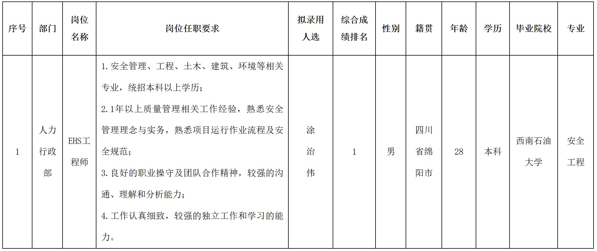 根據(jù)四川波鴻實(shí)業(yè)有限公司發(fā)布的招聘公告及招聘相關(guān)規(guī)定,經(jīng)面試、體檢等程序,擬錄用涂治偉同志到威斯卡特(綿陽(yáng))汽車(chē)零部件制造有限公司工作,現(xiàn)予以公示,具體情況如下: