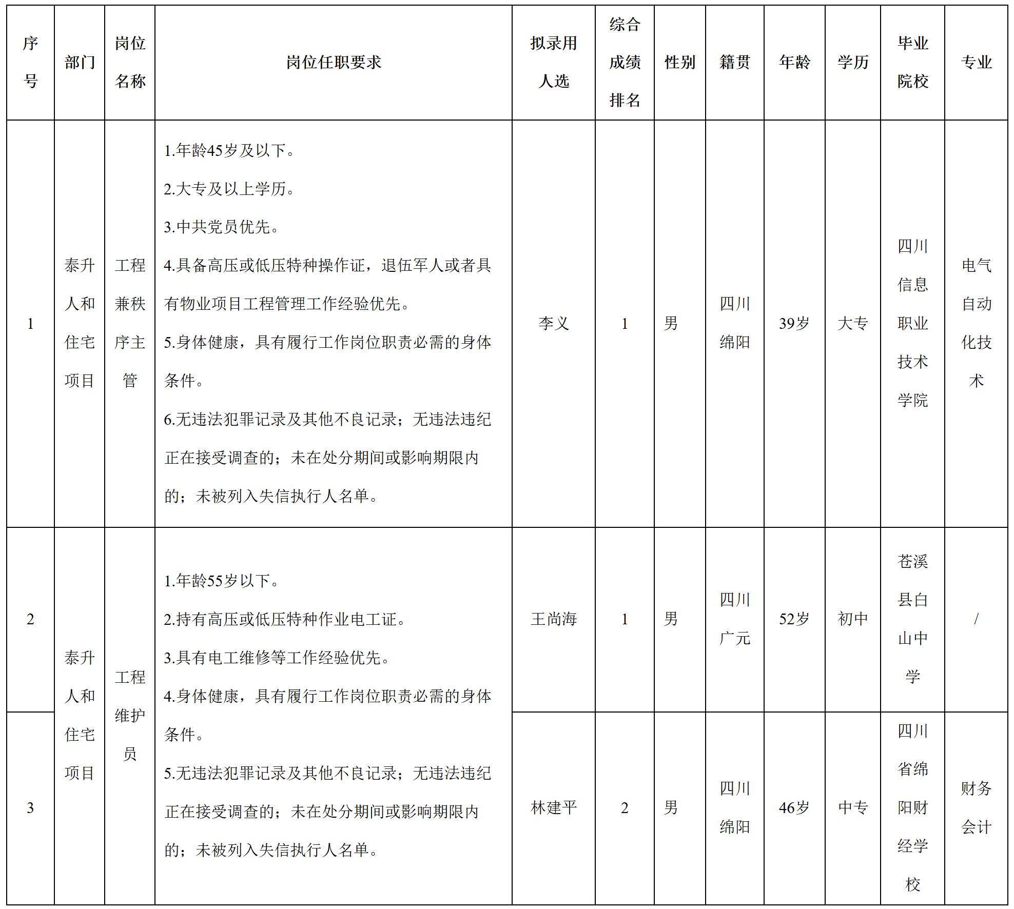 根據綿陽科發(fā)商業(yè)服務有限公司(原綿陽科發(fā)物業(yè)服務有限公司)發(fā)布的招聘公告及招聘相關規(guī)定,經筆試、面試、考察、體檢等程序,擬錄用李義等3名同志到泰升人和住宅項目工作,現(xiàn)予以公示,具體情況如下:
