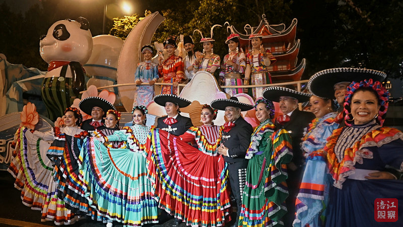 來(lái)自海內(nèi)外的24支表演團(tuán)隊(duì)和25輛絢麗花車,共同打造“多元文化,全城共歡”的國(guó)際節(jié)慶現(xiàn)場(chǎng)。其中,一輛以白藍(lán)為主色調(diào)、繪有辛夷花與羊角花紋樣的花車格外引人注目——它從李白故里綿陽(yáng)而來(lái),攜帶著蜀地的風(fēng)雅與科技城的夢(mèng)想。
