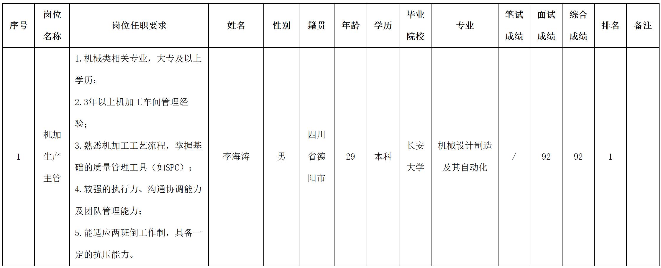 根據(jù)四川波鴻實業(yè)有限公司發(fā)布的招聘公告及招聘相關(guān)規(guī)定,經(jīng)面試等程序,現(xiàn)將面試成績予以公示。