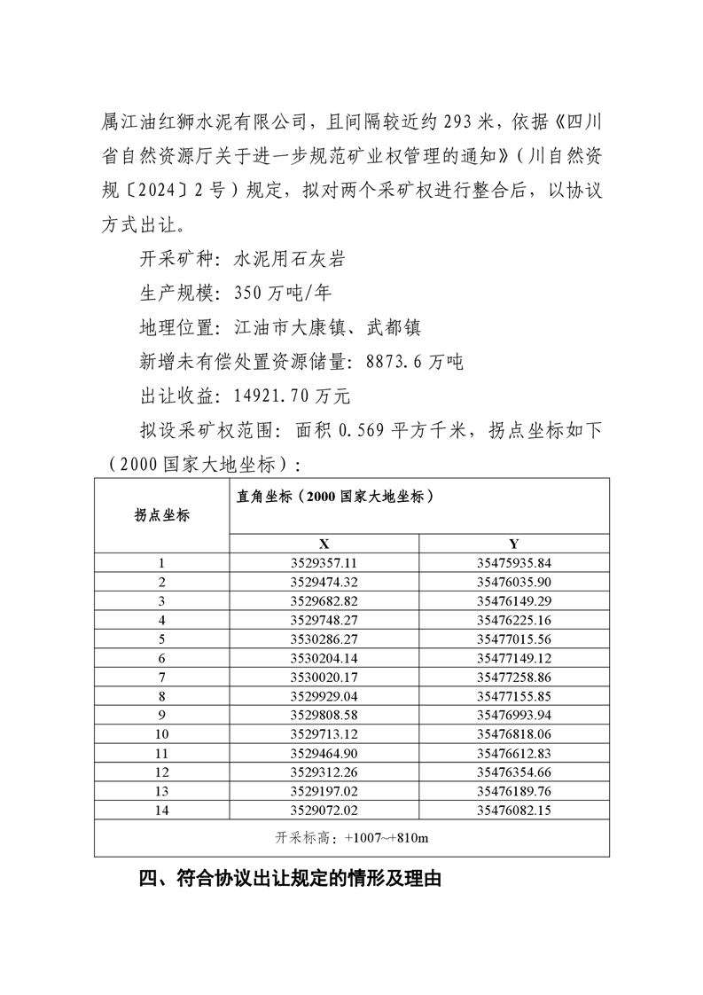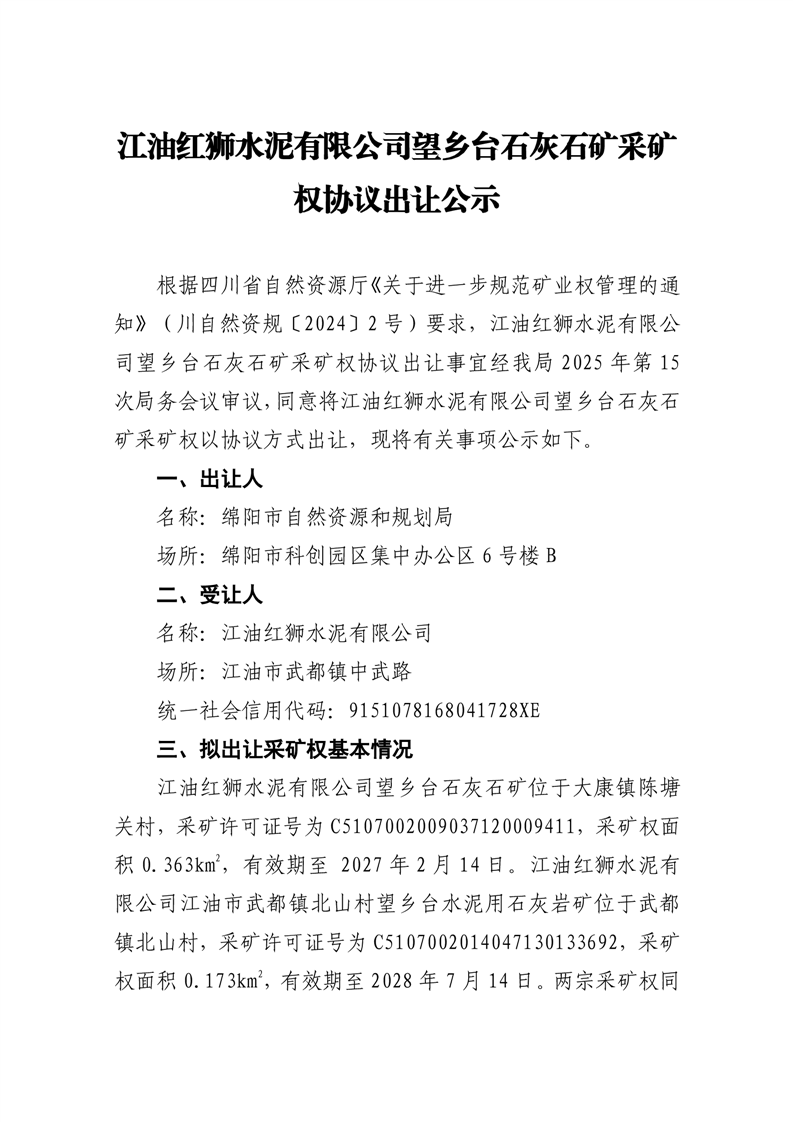 江油紅獅水泥有限公司望鄉(xiāng)臺(tái)石灰石礦采礦權(quán)協(xié)議出讓公示