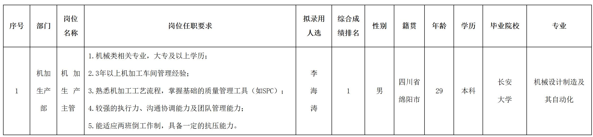 根據(jù)四川波鴻實(shí)業(yè)有限公司發(fā)布的招聘公告及招聘相關(guān)規(guī)定,經(jīng)面試、體檢等程序,擬錄用李海濤同志到威斯卡特(綿陽(yáng))汽車(chē)零部件制造有限公司工作,現(xiàn)予以公示,具體情況如下: