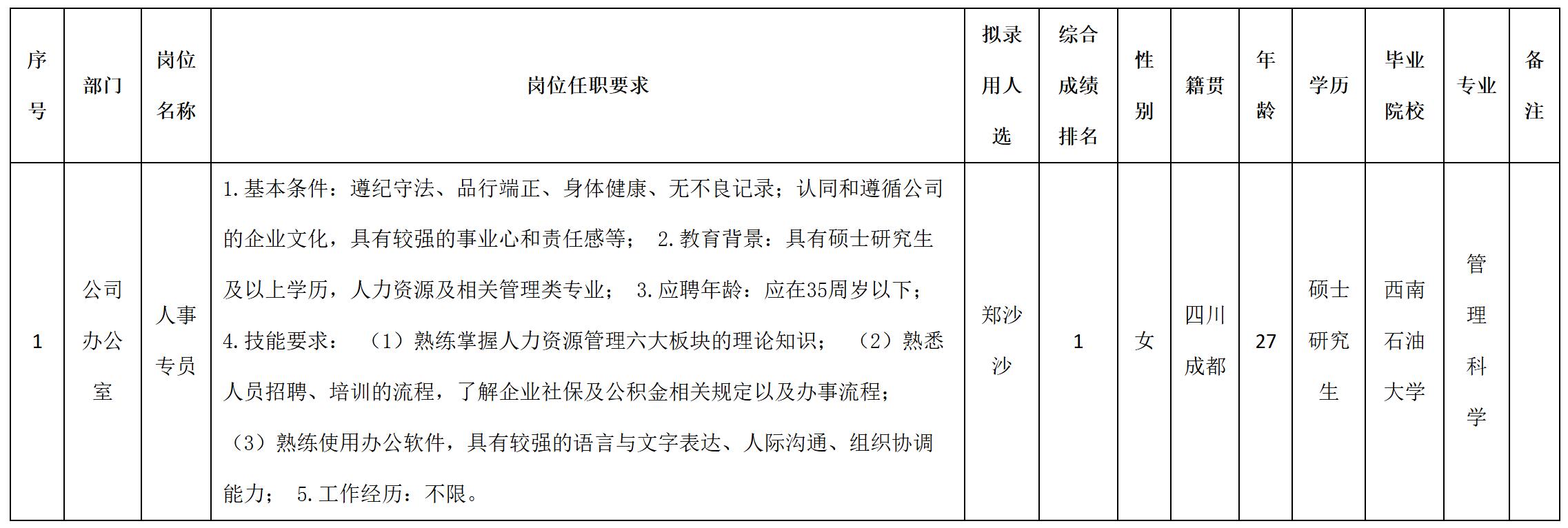 根據(jù)四川湖山電器股份有限公司發(fā)布的招聘公告及招聘相關(guān)規(guī)定,經(jīng)筆試、面試、考察、體檢等程序,擬錄用鄭沙沙同志到四川湖山電器股份有限公司工作,現(xiàn)予以公示,具體情況如下: