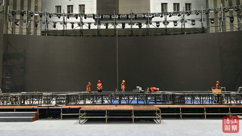 鋼琴與人形機(jī)器人背后的開幕式主舞臺(tái)上,巨大的異形主屏幕結(jié)構(gòu)已初具規(guī)模,工人們正進(jìn)行最后的吊頂和異形梯步搭建。綿陽科發(fā)會(huì)展旅游有限責(zé)任公司副總經(jīng)理張琨向記者透露,預(yù)計(jì)將于今晚或明日凌晨完成主會(huì)場(chǎng)搭建工作。