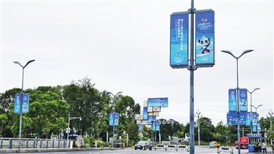 除火炬廣場、南郊機場外,富樂山酒店、科發(fā)鉑驪酒店等重要接待酒店也設(shè)置了統(tǒng)一歡迎畫面與科技感裝置,場館周邊路口也擺放了道路導(dǎo)視牌。50根燈桿上的節(jié)能LED動態(tài)道旗以醒目方式,指引著這場“從‘科技領(lǐng)航’到‘未來奔赴’的沉浸式體驗”的到來。