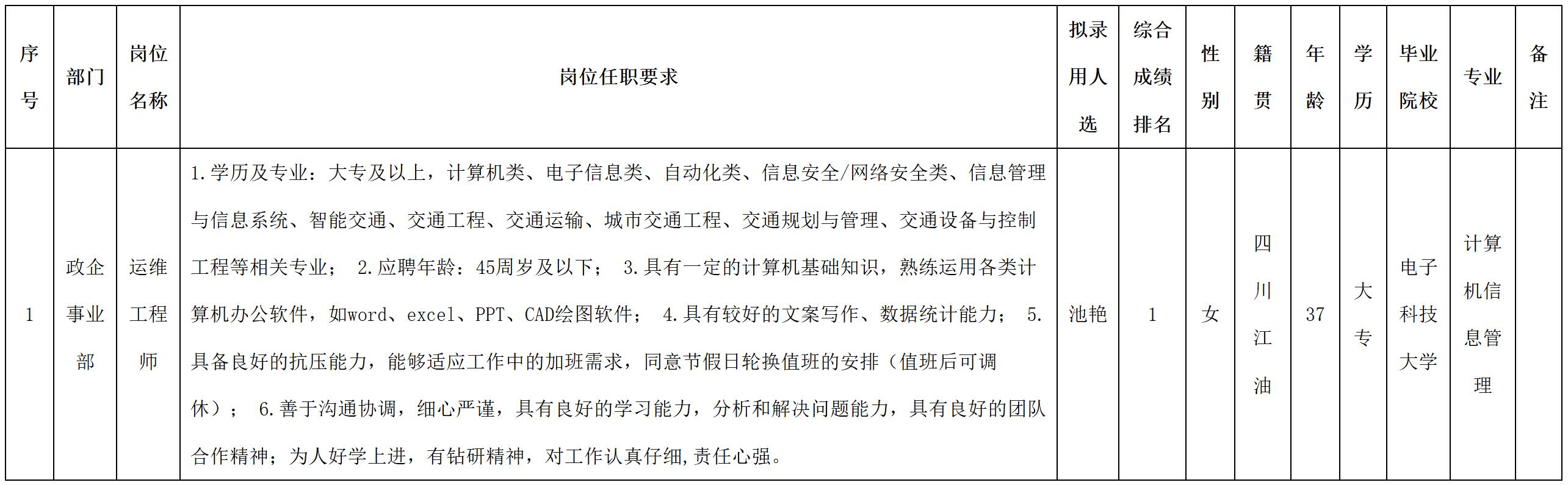 根據(jù)四川九洲投資控股集團(tuán)有限公司軟件與數(shù)據(jù)智能軍團(tuán)發(fā)布的招聘公告及招聘相關(guān)規(guī)定,經(jīng)筆試、面試、考察、體檢等程序,擬錄用池艷同志到四川九洲投資控股集團(tuán)有限公司軟件與數(shù)據(jù)智能軍團(tuán)工作,現(xiàn)予以公示,具體情況如下: