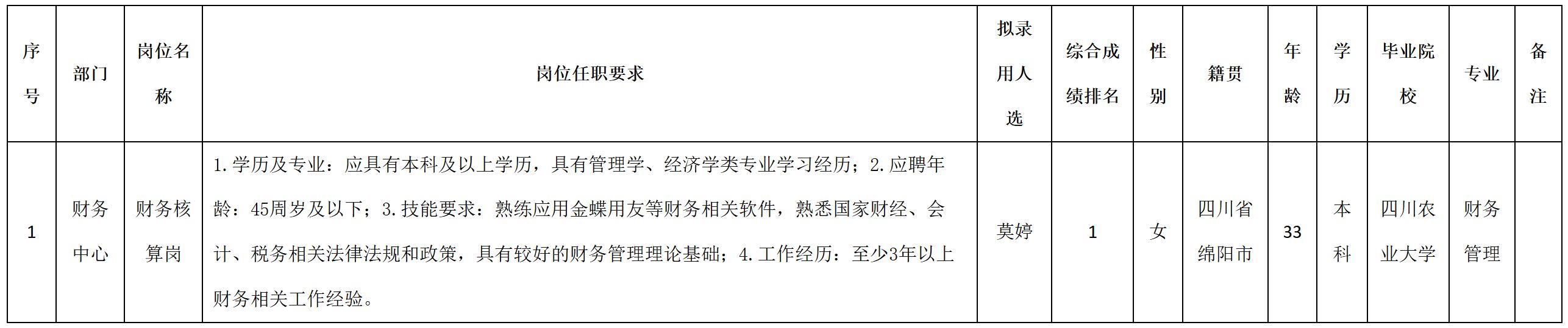 根據(jù)四川九州光電子技術有限公司發(fā)布的招聘公告及招聘相關規(guī)定,經(jīng)筆試、面試、考察、體檢等程序,擬錄用莫婷同志到四川九州光電子技術有限公司工作,現(xiàn)予以公示,具體情況如下:
