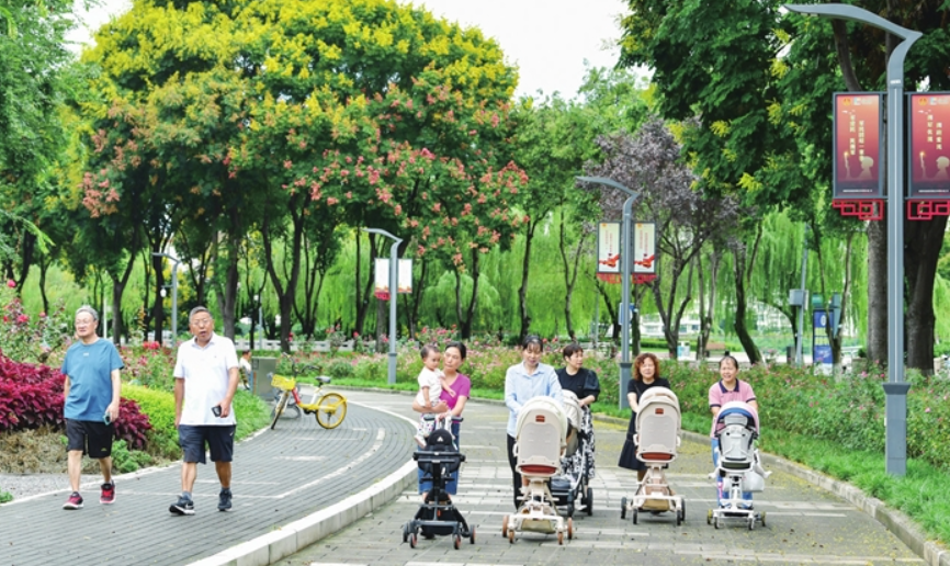 一場(chǎng)秋雨后,市民走出家門漫步健康步道。