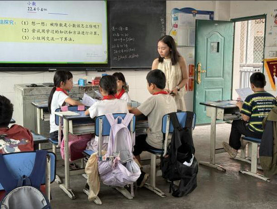 李老師五年級《小數(shù)的除法》教學則凸顯了對知識邏輯與學生差異的關注。教師以“整數(shù)除法算理”為鋪墊,通過“問題導入—對比探究—分步拆解”的清晰思路,精準突破“商的小數(shù)點與被除數(shù)小數(shù)點對齊”這一核心難點。同時,課堂設計了基礎計算、實際應用題等分層練習,兼顧不同學習水平學生;更通過小組討論引導學生自主總結算法,在掌握知識的同時,有效培養(yǎng)了邏輯思維與合作能力。小組討論氣氛熱烈,小組代表匯報發(fā)言中,小組長聲音清晰、洪亮,展現(xiàn)出良好的學生們合作意識與問題解決能力。