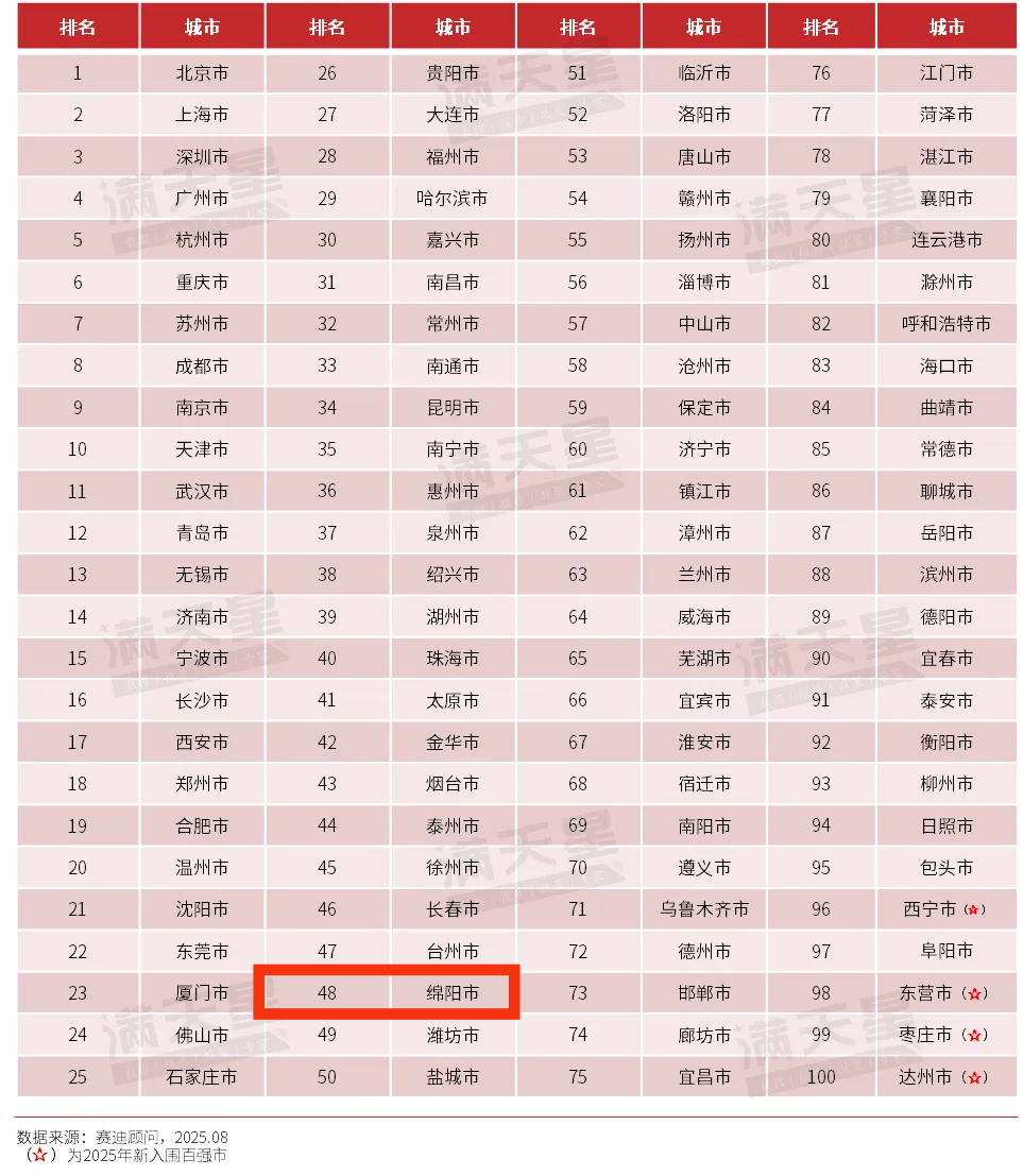 9月25日,賽迪顧問發(fā)布《2025年中國數(shù)字城市競爭力研究報告》,2025年數(shù)字百強市名單出爐,綿陽位列第48位,較2024年上升2位,位居全省第2,僅次于成都。
