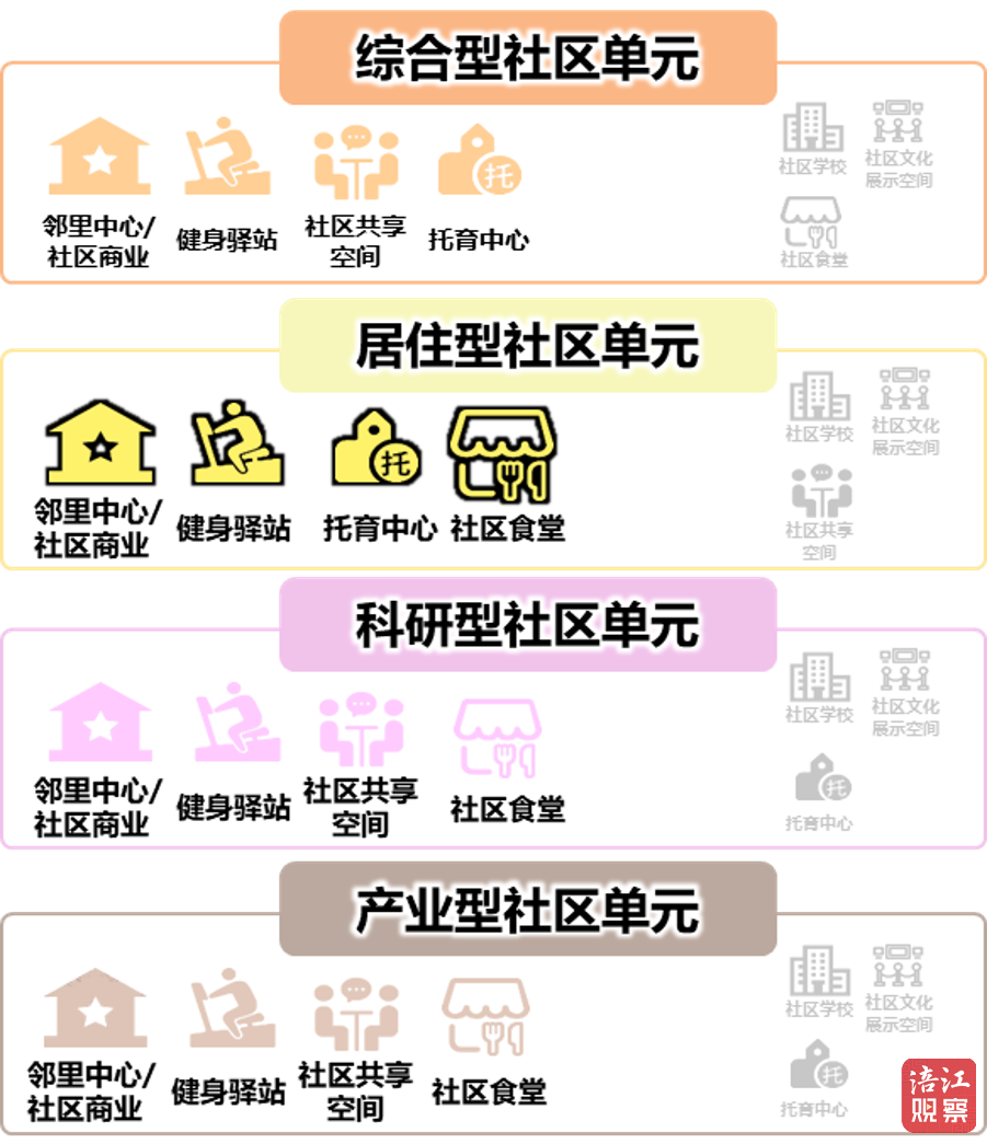 同時(shí)又將社區(qū)級(jí)單元分為了居住型、綜合性、科研型、產(chǎn)業(yè)型四類,為后期差異性多樣化配制公共服務(wù)設(shè)施,提供了基礎(chǔ),確保城市管理既全面又精細(xì)。