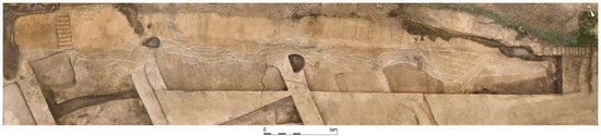 斗山遺址發(fā)現(xiàn)的馬家浜文化時期的墻體與壕溝(部分)。(江蘇省文物考古研究院供圖)