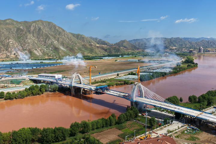 8月29日拍攝的蘭州什川黃河大橋順利完成中跨合龍(無人機(jī)照片)。(蘭州市委宣傳部供圖)