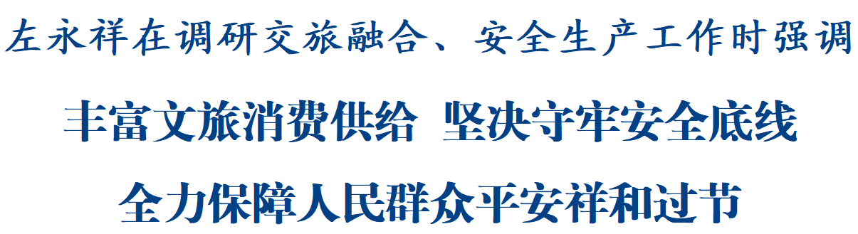 綿陽(yáng)新聞網(wǎng)訊 9月29日下午,省委常委、市委書(shū)記左永祥調(diào)研交旅融合、安全生產(chǎn)工作。他強(qiáng)調(diào),要深入貫徹習(xí)近平總書(shū)記重要指示精神,全面落實(shí)黨中央、國(guó)務(wù)院和省委、省政府部署要求,堅(jiān)持以人民為中心的發(fā)展思想,豐富文旅消費(fèi)供給、堅(jiān)決守牢安全底線(xiàn),全力保障人民群眾平安祥和過(guò)節(jié)。