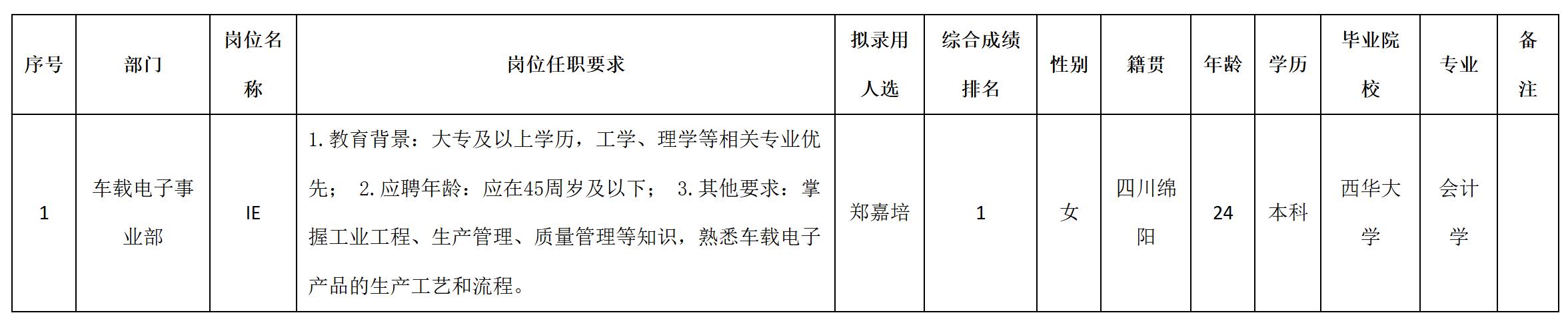 根據(jù)四川九州電子科技股份有限公司發(fā)布的招聘公告及招聘相關(guān)規(guī)定,經(jīng)筆試、面試、考察、體檢等程序,擬錄用鄭嘉培同志到四川九州電子科技股份有限公司工作,現(xiàn)予以公示,具體情況如下: