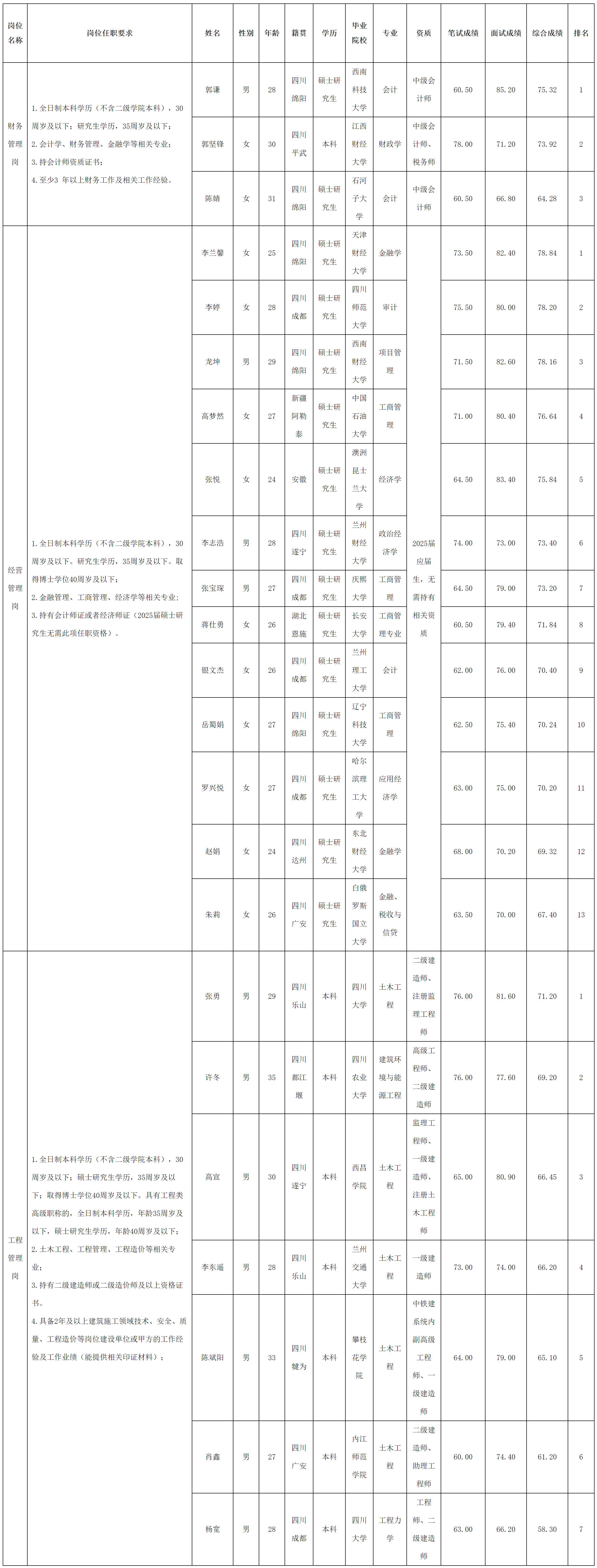 根據(jù)綿陽機(jī)場(集團(tuán))有限公司2025年8月發(fā)布的《關(guān)于2025年秋季招聘財務(wù)管理等崗位的公告》以及招聘相關(guān)規(guī)定,現(xiàn)將財務(wù)管理崗、經(jīng)營管理崗、工程管理崗筆試、面試、綜合成績按照排名予以公示。