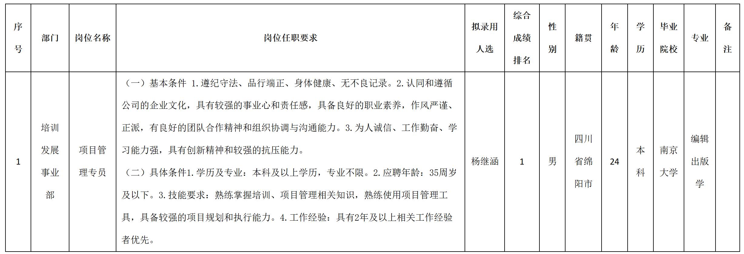 根據(jù)四川九洲教育投資管理有限公司發(fā)布的招聘公告及招聘相關(guān)規(guī)定,經(jīng)測試、考察、體檢等程序,擬錄用楊繼涵同志到四川九洲教育投資管理有限公司工作,現(xiàn)予以公示,具體情況如下: